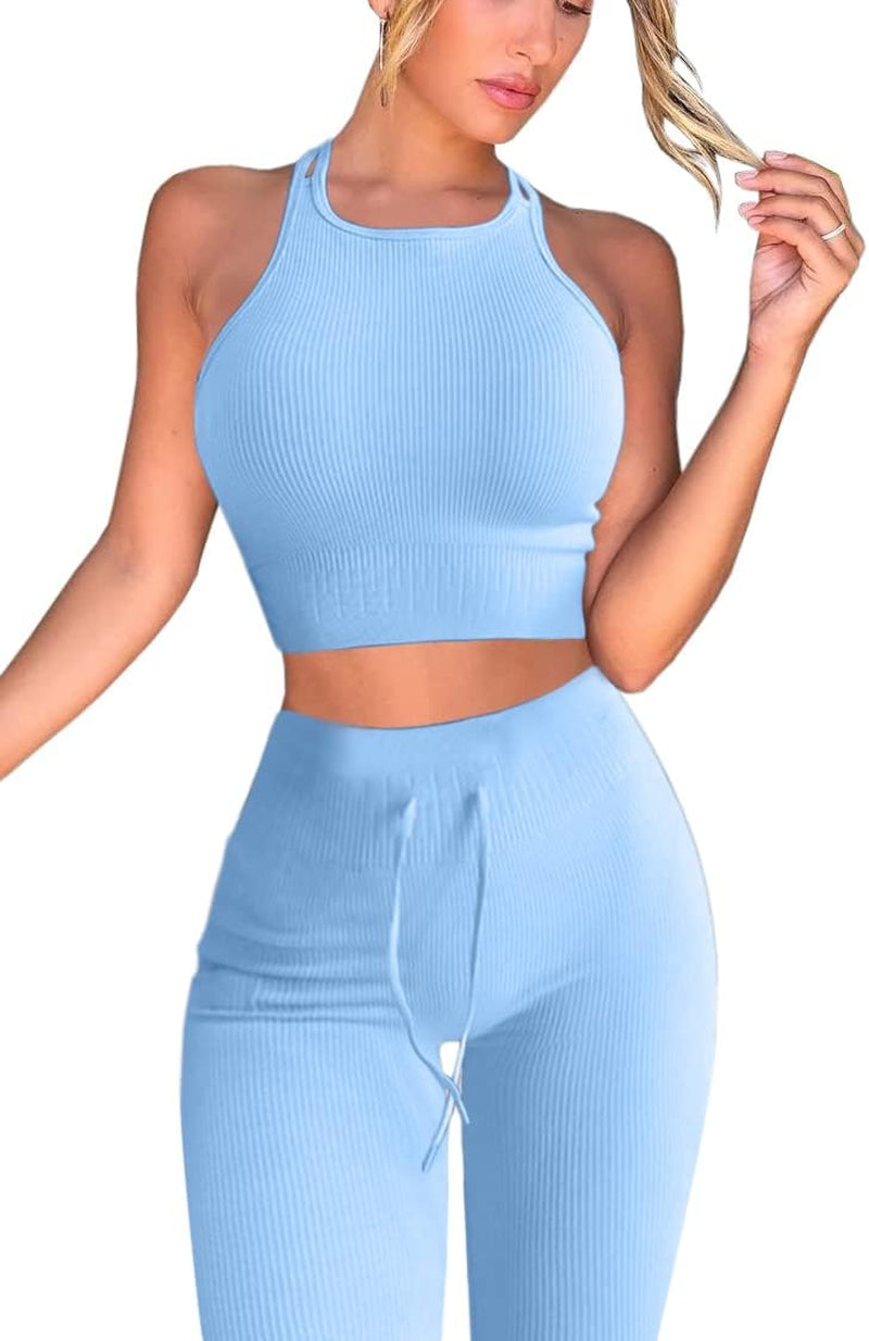 QINSEN Stretchy Two Pieces Yoga Outfits, Ribbed Crop Tank High Waisted Leggings Fitted GMY Activewear